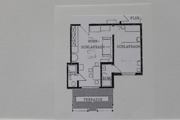 Diese Wohnung ist ca. 50 qm groß und besteht aus einem Wohn-Schlafraum mit Dusche / WC, einem Schlafraum mit Dusche / WC und einer Terrasse. Sie ist idealerweise für eine Belegung mit 2 Personen ausgerichtet.