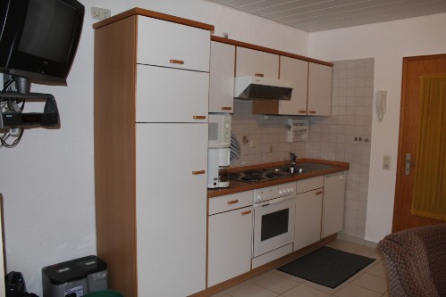Wohn-Schlafraum: Sitzgruppe mit Schlafcouch, Küchenzeile mit Herd und Dunstabzugshaube, Kühl-Gefrierkombination, Geschirrspüler und Mikrowelle, Essecke