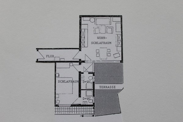 Diese Wohnung ist ca. 65 qm groß und besteht aus einem Flur, einem Wohn-Schlafraum, einem weiteren Schlafraum, 2 getrennten Duschen mit WC und einer Terrasse. Sie ist idealerweise für eine Belegung mit 2 Personen ausgerichtet.